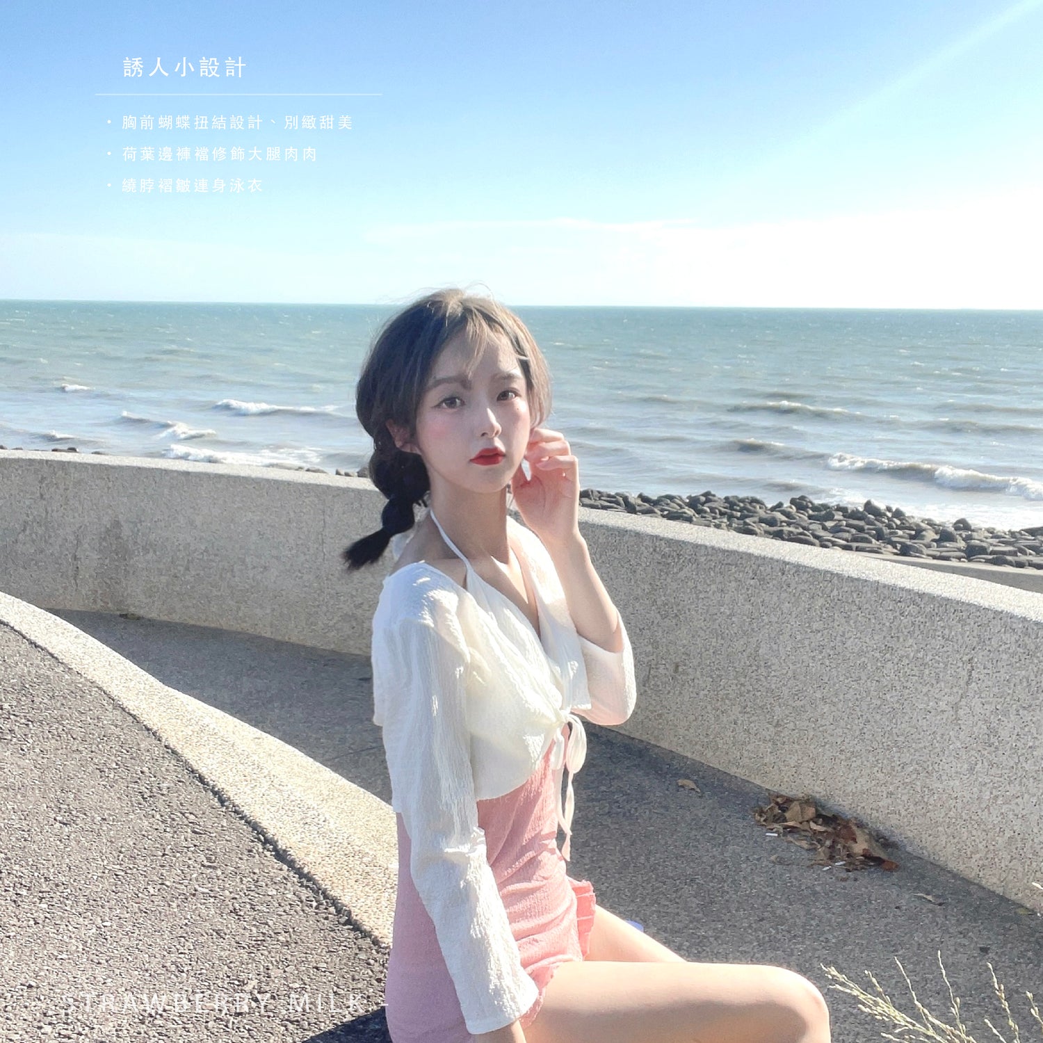 - 繞頸細帶 胸前扭結 下身顯瘦荷葉邊
